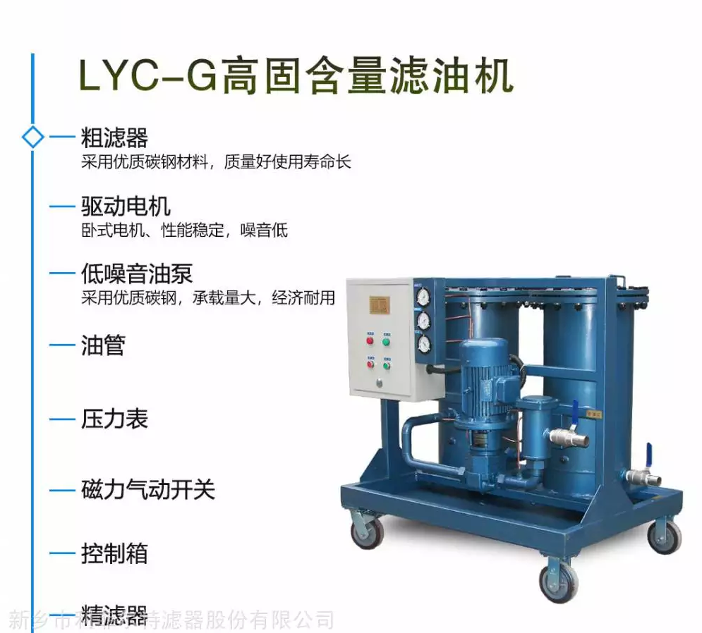 1、LYC-G高固含量油濾油機(jī)特別適應(yīng)于油液污染嚴(yán)重,油中固體含量較高的場合。尤其適應(yīng)廢油再生的澄清過濾。