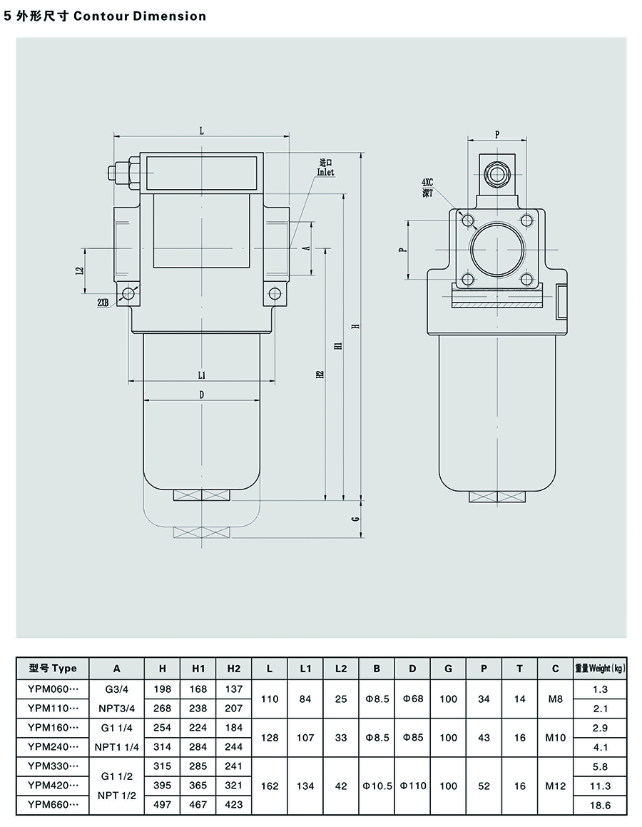 YPM-壓力管路過濾器配套濾芯的過濾材料可根據(jù)不同場合分別采用復合纖維、木棉定型濾紙、不銹鋼燒結氈、不銹鋼紡織網(wǎng)。采用復合纖維、不銹鋼燒結氈為過濾材料的濾芯,具有通油能力大,初始壓力損失小,納污容量大,過濾精度高等優(yōu)點,其過濾精度以絕對過濾精度標定,過濾效率n ≥99.5%,符合ISO標準。不銹鋼燒結氈成本較高,一般用于溫度較高的液壓系統(tǒng)。采用木棉定型濾紙為過濾材質的濾芯,具有通油能力大,初始壓力損失小,成本較低,適用于采用礦物油液壓系統(tǒng)。采用不銹鋼網(wǎng)為過濾材質的濾芯,阻塞后清潔比較容易,能反復使用。過濾器上、下殼體采用鋁鍛件,體積孝重量輕、結構精巧、外形美觀。